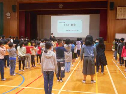今年度の月に1度の朝会は,3学年ごとに分かれて行っています。