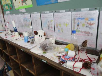 お家から用意してきた材料と学校の運動場で集めた秋の自然で