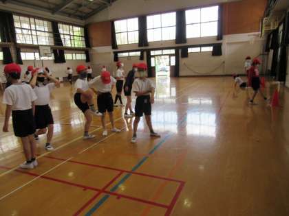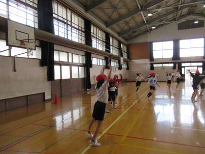 後半に行った まねっこジョギングは 先頭の動きに合わせて
