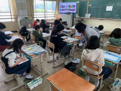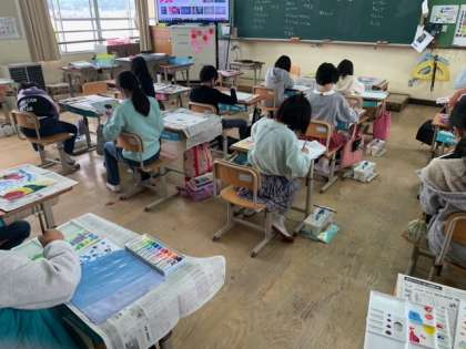 5年生では,図画工作科「心のもよう」で,今の心の様子を,絵具やパス,コンテ,画用紙などで自由に表現しました。色合いや大きさ,形など,抽象的なものに意味をつけて,自分の思いを表していました。
