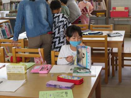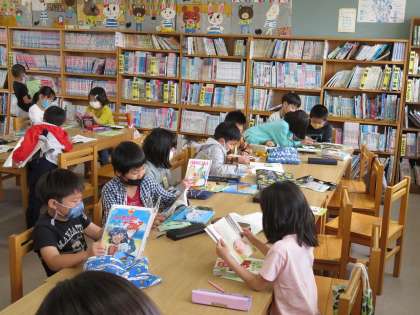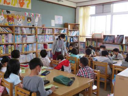 今日は,図書館司書の長谷(ながや)先生に本の秘密について教えていただきました。本を探しやすいように,学校図書館では分類ごとに本が整理されていることを知りました。子どもたちは,本がとても好きなようです。黙々と読んだり,読書ノートに記入したりする様子が見られ,ほっこりする時間となりました。