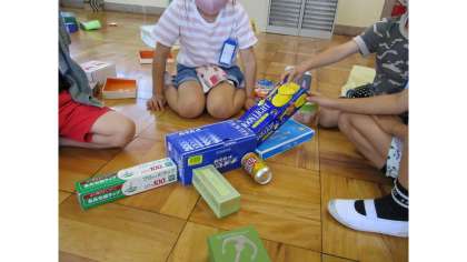 空き箱や空き缶で,いろいろなものの形を作る活動を楽しみながら,図形の特徴「つむことができる」「ころがることができる」「両方できる」などの特徴を理解しました。「高く積むには,下の方を頑丈にしないとあかんなぁ!」「筒の形やと転がるから,転がらないように,底の部分を考えないといけないね!」などと,友達同士で色々と相談しながら,高く積むことに挑戦していました。