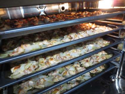 「鶏肉のてり焼き」は鶏肉を調味液で漬け込み玉ねぎと一緒にスチームコンベクションオーブンで焼きました。鶏肉がふっくらと香ばしく焼け、玉ねぎの甘味も味わえました。