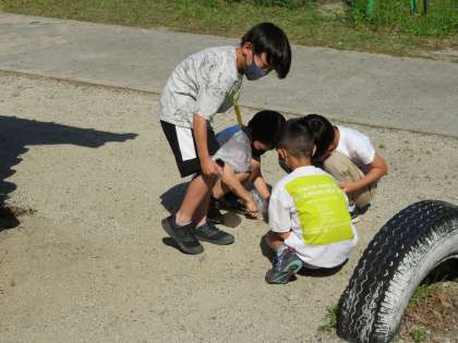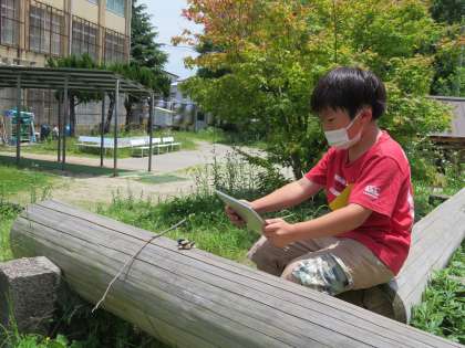 図画工作科の学習では,石の形や色などの感じを基に自分のお気に入りの石を見つけ,作品を作っています。また,作品はタブレットを使って画像を撮り,その後は鑑賞会を行う予定です。鑑賞会では,どんな作品が見られるのか楽しみです。