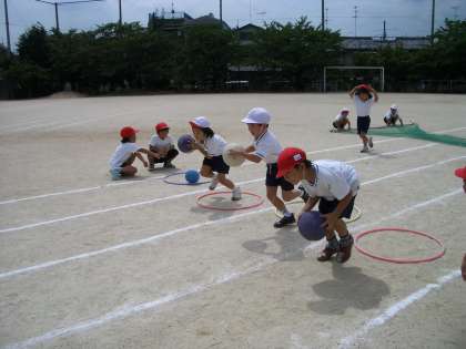 今日は障害物走の練習をしました。ゴムを跳んで、あみをくぐって、ボールを運んでゴールイン。1位を目指して走りぬけました。