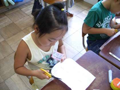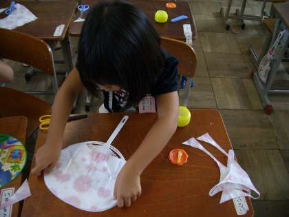 水曜日にあさがおの汁で作った染め紙で、うちわを作りました。うちわを染め紙に写して、切って、はりました。涼しげな作品がたくさんできました。ぜひお家で使ってください。