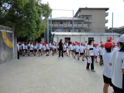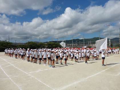 晴天の中,全校練習がありました。入退場のしかた,開閉会式の流れ,エントリー種目の並び方などを練習しました。
