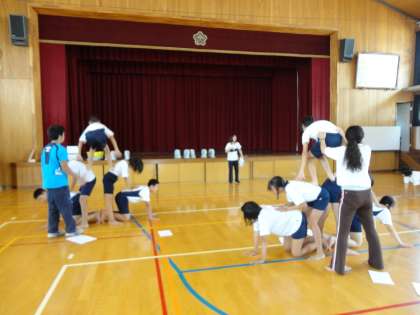 組体操ではタワーに取り組みました。3段タワーはパワーやバランスが大事で,なかなか難しかったようです。しかしどのタワーも成功しました!成功したとき,大きな拍手がわき起こりました。一回目にしてはとてもすばらしかったです。