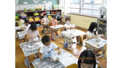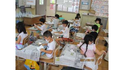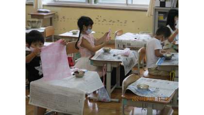 子ども達一人一人が大切に育ててきたアサガオの花で「色水あそび」をしました。アサガオの花の色によって,染紙の色もちがい,オリジナリティたっぷりの作品に仕上がりました。今週は,この染紙でうちわ作りに挑戦します。どんなうちわに仕上がるのか,今からとても楽しみです。