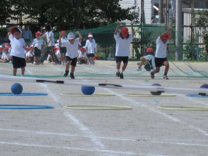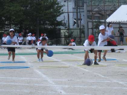 ごむひもを飛び、網をくぐり、ボールをはこびました。