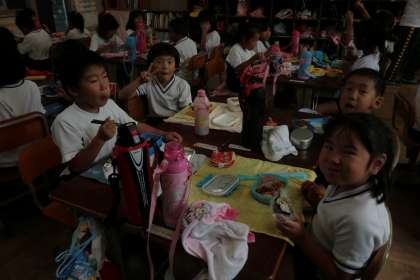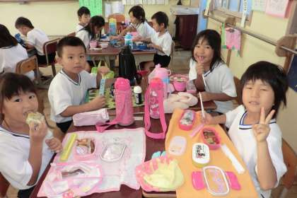 お家の方が朝早く作ってくれた、お弁当。子どもたちは「おいしい、おいしい。」と言いながら、とてもうれしそうに食べていました。