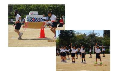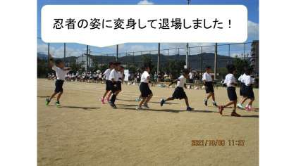 団体競技「元気・勇気100%〜1年生忍者ここに参上!〜」では,勇気100%の曲に合わせて1年生らしく笑顔でダンスを踊り,その後二人で力を合わせておみこしリレーをしました。結果は僅差で赤組が勝ちました。白組も二人の息をしっかりと合わせて,おみこしを運んでいました。最後は,忍者に変身して退場しました。