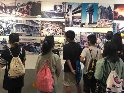 今も残る断層の様子に驚いたり、当時のようすの写真を見入ったりしながら,命の大切さについても学んでいました。