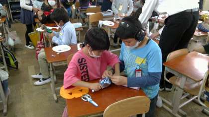 くすのき学級の子ども達と飾りづくりをしました。10月といえば「ハロウィン」です!くすのき学級の子どもたちが中心となって3年生に作り方を教え,協力してお面とキャンディを作っていました。