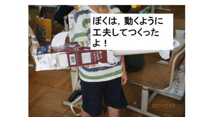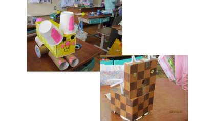 箱の形や色からおもいついたものを,「ああでもない・こうでもない」と言いながらとても楽しそうに作品作りに取り組んでいました。体が動くようにしたり,口が開くようにしたりと,子どもたちなりに工夫をいっぱい取り入れた作品となりました。できあがった友達の作品を見て,「○○さんのめちゃくちゃかわいい!」「○○さんのすごい!」などと,友達の作品のよさを見つけていました。