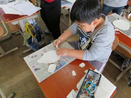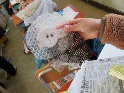 3年生では,いろいろな素材を使って,形や模様を工夫しながら版画の版を作っています。また,素材を重ねつける,動きをつけるなど子どもたち同士でアドバイスをしながら作成することで,オリジナルの動物を作り上げていました。