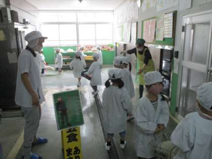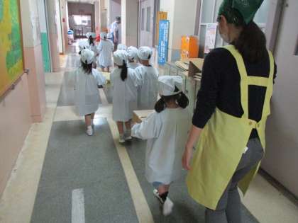 待ちに待った給食が4月14日から始まりました。給食の準備の仕方を知り,当番は給食のサービスホールへ!協力しながら教室まで気をつけて運びます。