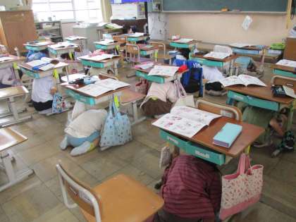地震にともない,火事が起こった際の訓練でした。教室での一時避難では,しっかりと机の下にかくれて身を守りました。その後,全員が安全に運動場に避難しました。