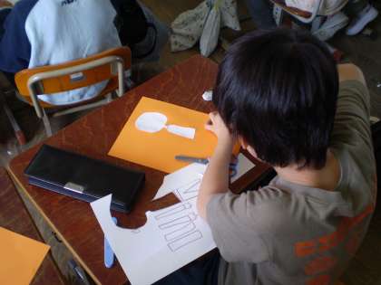 今日から,図工で紙版画の学習を始めました。今日は,紙に顔や手,胴体,足などの体のパーツをかいて,はさみで切り取り,台紙にのりではり付ける練習をしました。細かい部分をはさみで切ったり,のりではったりするのは少し難しかったようですが,ジャンプしていたり,両手をあげたり,いろいろなポーズができました。