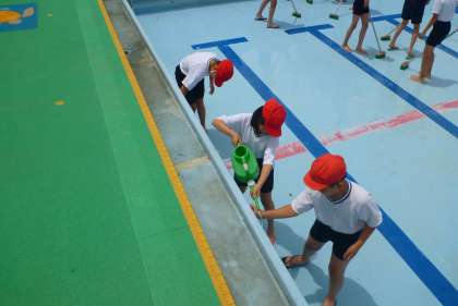 もうすぐ始まる水泳学習に向けて,5年生,6年生がプール掃除をしました。高学年としての大事な役割に,やりがいをもってがんばってくれていました。