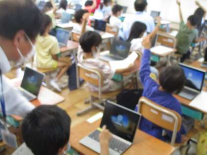 一人一台のタブレットを受け取り,初めてのパソコン学習をしました。今日のめあては,「ログイン」です。パソコンを使い始めるためにはIDとパスワードを入力しないといけません。ログインの仕方を知り,自分でやってみました。パソコンが起動すると,大喜びでした。