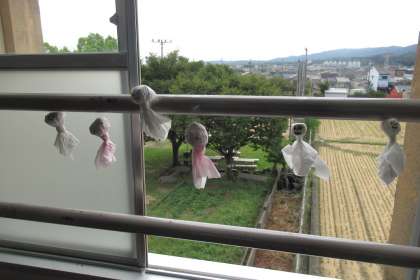窓際に 手作りのてるてる坊主が並びました。