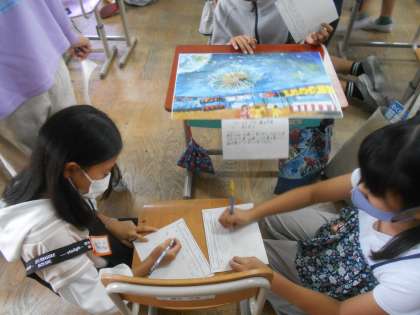 図工科では出来上がった作品を鑑賞し、思いを伝え合う活動をしています。