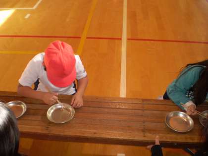 給食委員会のお兄さん,お姉さんが「豆つまみ大会」を開いてくれました。今日まで,休み時間などに時間を見つけて,子どもたちは練習をしてきました。練習の甲斐あって,素早く豆をつまめるようになってきましたが,「緊張したら上手くつまめない。」と,少し心配している子もいました。しかし,みんな練習通り上手くつまむことができ,どのチームもがんばりました。