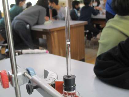 今回は、細い管を使って、水面の変化を観察しました。すると、お湯に入れると、水面が目印のテープからぐんぐんと上がっていきます。氷水に入れると、徐々に下がっていきます。これには子ども達も興奮!試験管の実験だけでは変化がよく分かりませんでしたが、今回ははっきりと結果が見えました!
