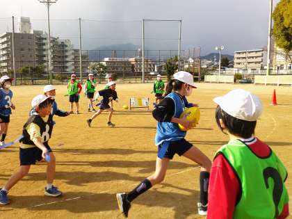 体育では、「陣取りゲーム」の単元で、タグラグビーに挑戦しています。