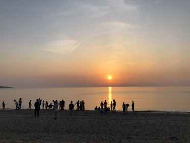 北淡震災記念公園を後にして、バスは宿泊先の「慶野松原荘」に到着しました。入館式を行い、食堂で夕食をいただきました。すき焼き、エビフライ、たまねぎ…などなど、美味しくいただきました。ご飯をおかわりする様子もありました。夕食の後は浜辺へ出て、きれいな夕日をみんなで見ました。