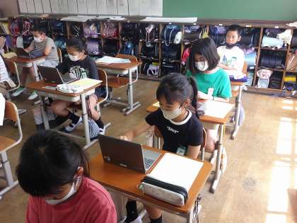 4年生は国語科で「アップとルーズで伝える」を使って学習をしています。文章から学んだことを生かし、学級目標である「レインボースマイル」につながるものを探して、写真をとってロイロノートにまとめています。学級目標を再認識しつつ、国語科の学習を生かしてほしいと思います。