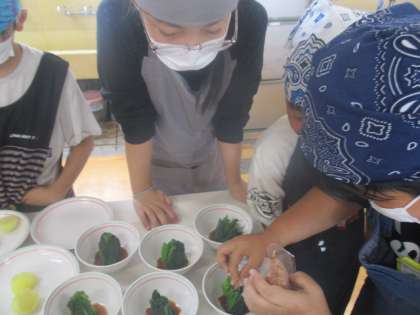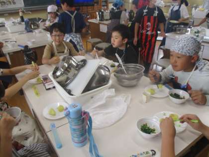初めての調理実習ということで、みんなやる気いっぱいでした。今回はゆでる調理に挑戦しました。食材によって、水からゆでるのか、湯からゆでるのかが違うなど、学んだことを意識しながら調理していきました。どのグループもおいしくでき、大成功でした。片付けも自分たちで役割を分担して素早く終えることができました。さすが5年生です。