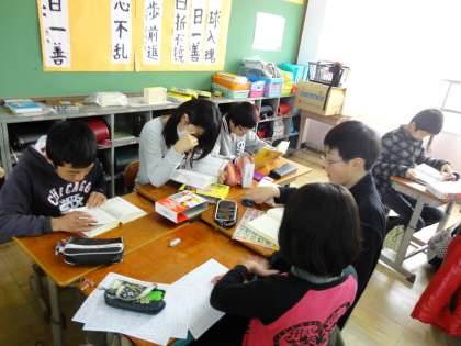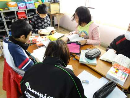 国語では,「カンジー博士のクイズ大会」という単元に取り組み,自分達でも漢字クイズを考えることにしました。班で漢字辞典や国語辞典,教科書などをたくさん活用しながら協力して難しいクイズを考えています。
