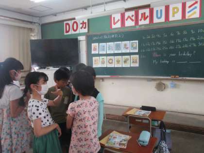 誕生日を英語で尋ね合う練習をしました。みんな自信をもって自分の誕生日を英語で言えるようになってきました。最後に、グループで誕生日順に並び合うゲームをして楽しみました。