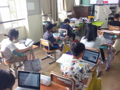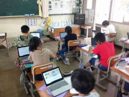 4年生は総合的な学習の時間で、ユニバーサルデザインについて調べています。今は、自分たちで興味をもったことを、タブレットを使って調べています。また、調べたことはグルーいプで共有し、さらに調べ学習を深めていく予定です。