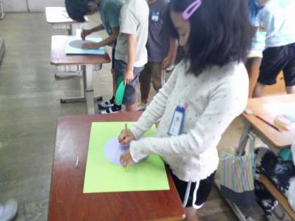 図工の学習では、わりピンを使って画用紙がくるくる回る仕組みを作って、作品作りをしました。