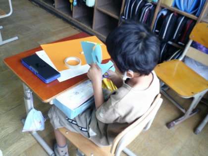 回る仕組みから、表したいものを想像し、それぞれに立体的に表していました。また、お友だちの作品から、表現のよさを感じ自分の作品に生かす様子もありました。