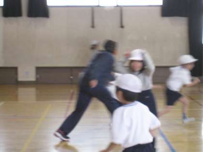 体育の授業の始めに、体を温めるために毎時間おにごっこをしています。