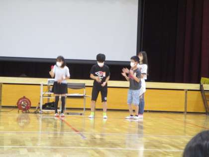 6月のみなうずタイム・スマイルタイムがありました。児童会からは、梅雨の時期の過ごし方についての呼びかけがありました。校舎の中では走り回らず、けん玉や読書などをして過ごしたらいいと、劇を交えて伝えていました。