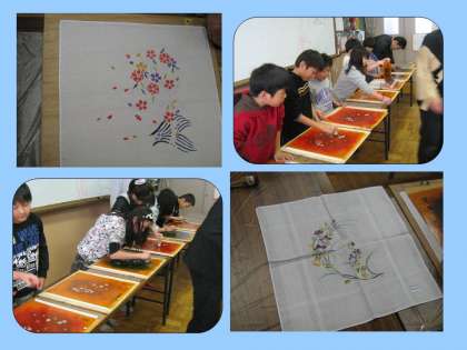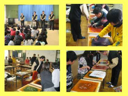 2月10日(金)の3,4校時に,京友禅協同組合連合会の方4名に来ていただいて,4年生の61名が,京都の伝統工芸である「型友禅」を体験しました。