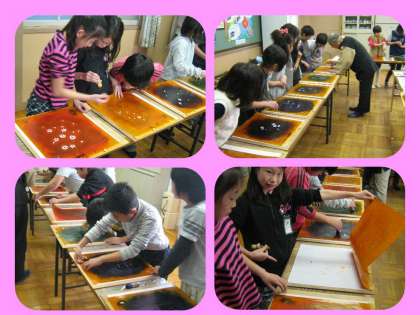 子どもたちは少しずつ色が重なって,模様ができあがっていく伝統的な方法を楽しみながら,きれいなハンカチに仕上げていました。