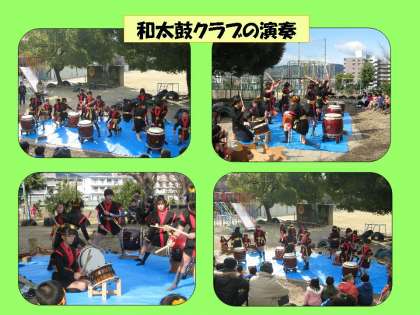 最初に,本校の和太鼓クラブの子どもたちの演奏です。お休みがあって全員揃うことはできませんでしたが,参加した子どもたちは,力いっぱいの演奏をして,たくさんのお客さんから大きな拍手をいただきました。