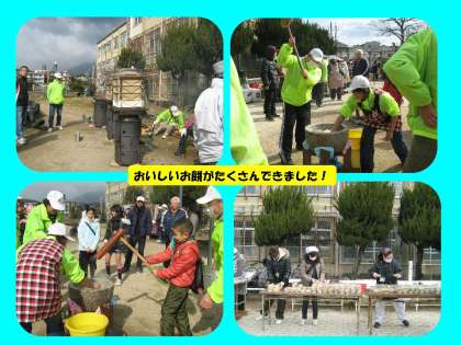 校庭では,早くから準備していただいた「餅つき」が始まりました。リズムにのってどんどんお餅がつきあがっていきます。子どもたちも餅つきを体験しました。「きな粉,あんこ,あおのり」などのおいしいお餅をもらって,大人も子どもも大満足でした。
