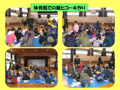 体育館では,PTAとおやじの会が一緒に「紙ヒコーキ作り」を教えていただきました。かんたんなヒコーキから,少し難しいヒコーキまでいろいろと準備していただきました。親子,またはおじいちゃんたちと参加した子どもたちもいました。