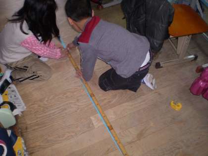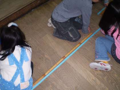 両手を広げた長さで紙テープを切り,ものさしで長さを測りました。30cmものさしで測るのは大変なので,100cmのものさしを使いました。そんなに長いものさしがあることに,まず子どもたちは大変驚いていましたが,上手に使いこなしていました。