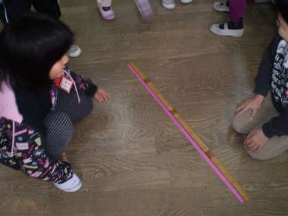1mの長さがどれくらいかだんだん分かってきました。今日はグループで,ものさしを使わずに紙テープを「1mと思う長さ」「2mと思う長さ」に切りました。1cmだけ長かったり,2cm短かったりと大変おしいグループもありました。どのグループもだんだん長さの感覚がつかめるようになってきました。