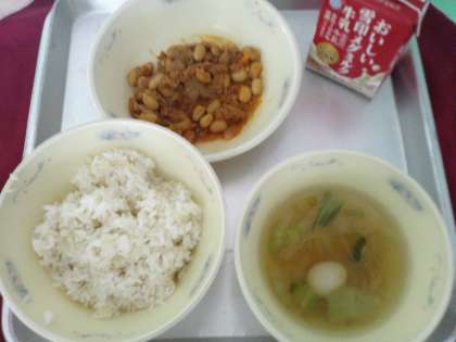 『大豆とツナのドライカレー』の「ドライカレー」は、汁気のないカレーのことです。給食では、大豆・まぐろフレーク・玉ねぎ・にんじんを使って作りました。おいしくなるように、大豆のゆで汁も使いました。