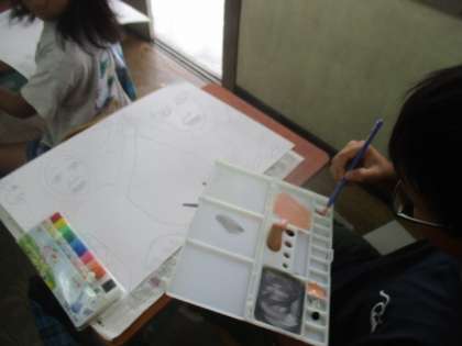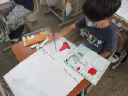 図工の時間にお話の絵に取り組んでいます。自分の好きな場面を自由に想像し絵に表しています。同じ本でも想像することは様々でとても面白いです。今週からはいよいよ色塗りです。自分の表したい場面の雰囲気をよく考え、工夫をして色を塗っています。どんな作品が出来上がるのか楽しみです。