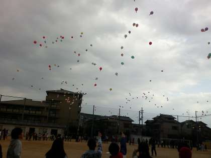 給食後には、バルーンリリースを全校で行いました。